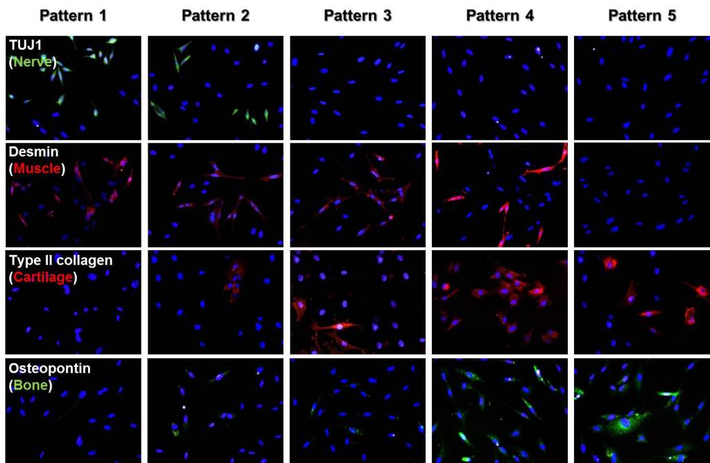 The image on the right illustrates this effect. These adipose-derived mesenchymal stem cells were cultured in a single dish, with images captured from various regions, each featuring distinct nanopatterns. Notably, the cells were grown without any additional supplements—only DMEM, FBS, and antibiotics were used—highlighting the intrinsic power of the nanoscale environment.